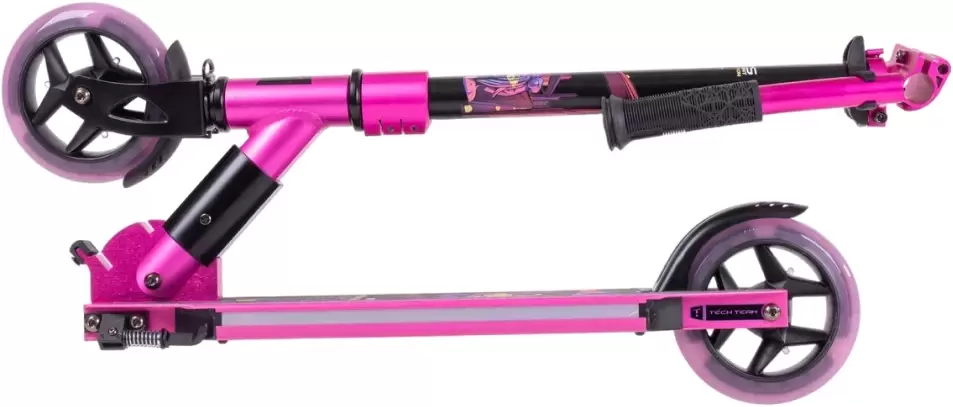 В 2024 году российский производитель Tech Team выпустил обновлённую модель, ориентированную на детей от 6 лет. Самокат получил светодиодные колёса диаметром 145 мм, которые гарантируют прекрасную манёвренность и долгий накат. Благодаря резиновой бесшумной проставке металлический ножной тормоз-крыло работает тихо — никаких лишних дребезжащих звуков. В конструкции предусмотрена складная подножка — она позволяет аккуратно парковать самокат в любом месте. Продуманная система складывания нового поколения делает транспортировку и хранение максимально удобными. По соотношению цены и качества модель можно назвать отличным выбором. Изюминка самоката — подсвеченная платформа, которая выгодно отличает его на фоне других средств передвижения.