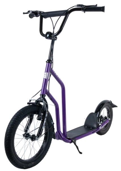 Колёса увеличенного диаметра — переднее 16 дюймов, заднее 12 дюймов. Благодаря этому самокат уверенно справляется с неровностями грунта, эффективно амортизируя удары и повышая комфорт во время длительных поездок.